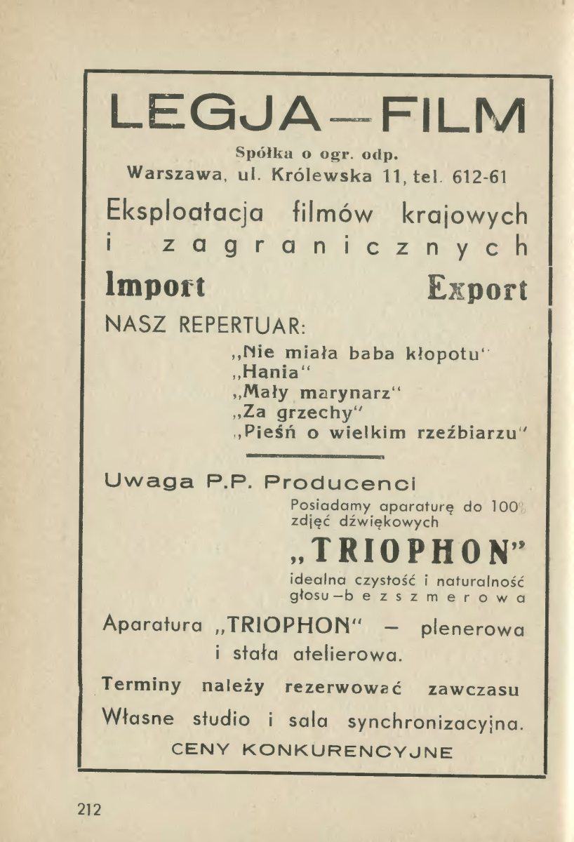Siedziba firmy producenckiej Legia-Film. W 1935 roku firma produkowała film Hania, jednak prace zostały wtrzymane. Do prac wrócono w 1936 roku, jednak film nigdy nie został ukończony. Prawdopodobnie firma upadła.